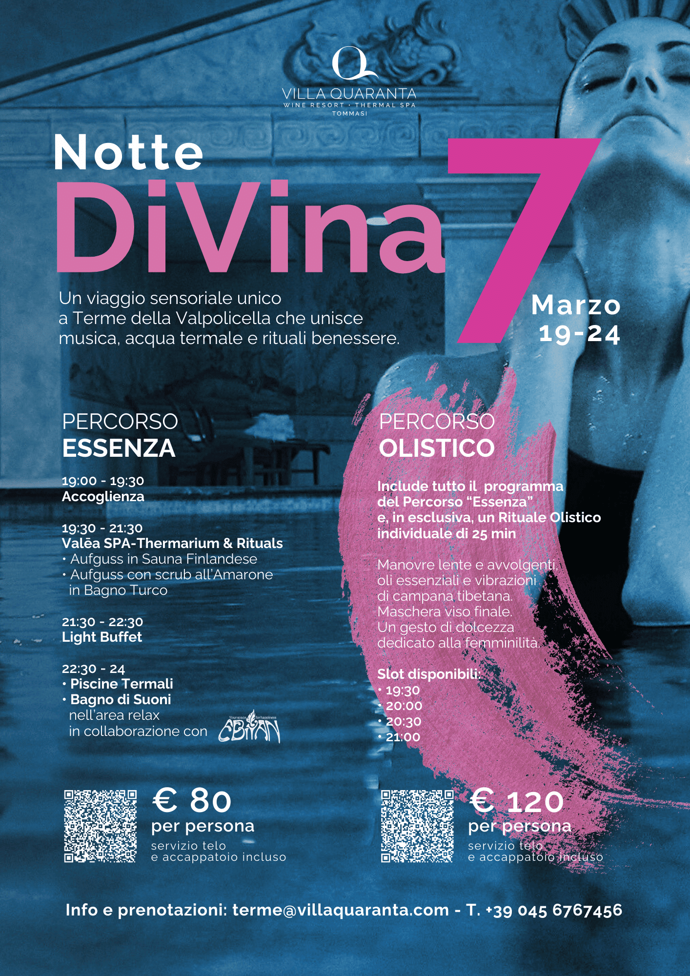 Sabato 7 marzo 2026, a Terme della Valpolicella, torna la Notte DiVina in una veste speciale “in rosa”: la serata che anticipa la Festa della Donna e invita a prendersi tempo, davvero. Con il Percorso Olistico, dalle 19:00 alle 24:00, vivi la Notte nella sua forma più autentica: acqua termale, calore del Thermarium, rituali aufguss e il Bagno di Suoni, fino al light buffet.